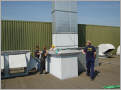 Die bereits montierten, 600 kg schweren und 8 Meter langen Absaugtürme wurde am Lasthacken des Hubschraubers eingehängt und mit höchster Präzision vom Hubschrauberpiloten Neumann aufgestellt sowie anschließend zum Montagepunkt auf dem Messedach geflogen. Trotz leicht aufkommenden Wind und erheblicher Thermik auf dem etwa 1.000 qm großen Teerpappe- Messedach setzte der Hubschrauber punktgenau seine Außenlast auf die bereits vorinstallierte Bodenkonstruktion auf. Blitzschnell rückte das Bodenteam den 8 Meter langen Turm in die vier Schraubverstrebungen und befestigte die Absauganlage an den ersten 4 Verschraubungen. Kurze Zeit darauf stand der erste Turm. Wenige Zeit später der Zweite.